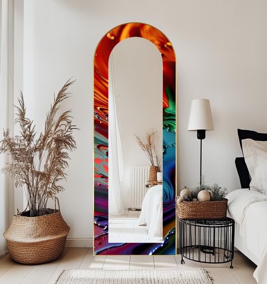 Arch Shaped Floor Mirror with Metal Frame – Gold, Black, or Silver | Leaning, Standing, or Wall-Mounted Full Body Mirror Add artistic charm and functional elegance to your space with our Arch Full Length Mirror, designed to make a bold statement in any room. Whether styled in a bedroom, hallway, or living room, this arched floor mirror enhances your interior with timeless beauty. The edges of the mirror consist of pictures in the colors of your choice printed on tempered glass using the UV printing technique. The mirror itself is mounted on top of this printed tempered glass, giving it a vibrant, durable, and luxurious finish that stands out in any setting. Measurements; TOTAL SIZE (Uv Printed Tempered Glass + Mirror) : 23,5’’W x 67’’ H ONLY MIRROR SIZE : 17’’W x 60,5’’ H Choose from three premium frame finishes—Arch gold mirror, sleek black, or arch floor mirror silver—and enjoy flexible use as a Standing Floor Mirror, Arched Wall Mirror, or casually leaned for a designer look. This is more than a Full Body Floor Mirror with Stand—it’s a piece of functional art. Multiple Placement Methods, This arched floor mirror comes with a U-shaped bracket, which you can freely place in the living room or bedroom. For your convenience in hanging on the wall, special hangers are designed on the back of the mirror.Our premium mirrors are crafted by gluing 4mm tempered glass to a 4mm mirror, combining durability and style. The tempered glass features UV printing for a glossy, vibrant look, while both the glass and mirror have smooth, grinded edges for safety. The hidden metal hanger ensures a sleek, ready-to-hang design, making it an elegant and functional addition to any room.