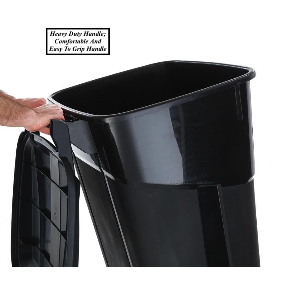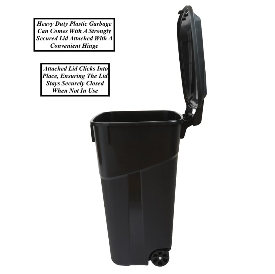 The 32 Gallon Wheeled Heavy Duty Plastic Garbage Can comes with a strongly secured lid attached with a convenient hinge. The attached lid clicks into place, ensuring the lid stays securely closed when not in use. Never worry about losing the lid in windy conditions. The easy grip handle with pass through divided handle design and the rugged wheels makes transporting your trash from the curb and back effortless. This heavy duty trash can is suitable for both indoor and outdoor storage. Specifications Color: Black Material: Polyproplene Assembled Product Dimensions (L x W x H): 22.38 x 21.00 x 33.50 Inches Assembled Product Weight: 7.1 LBS Volume Capacity: 32 gal Number of Compartments: 1 Recommended Location: Indoor and Outdoor Recommended Use: Household, Commercial Package includes 1 x 32 Gallon Plastic Garbage Can Note Please refer to the dimension and size of the product before purchasing.
