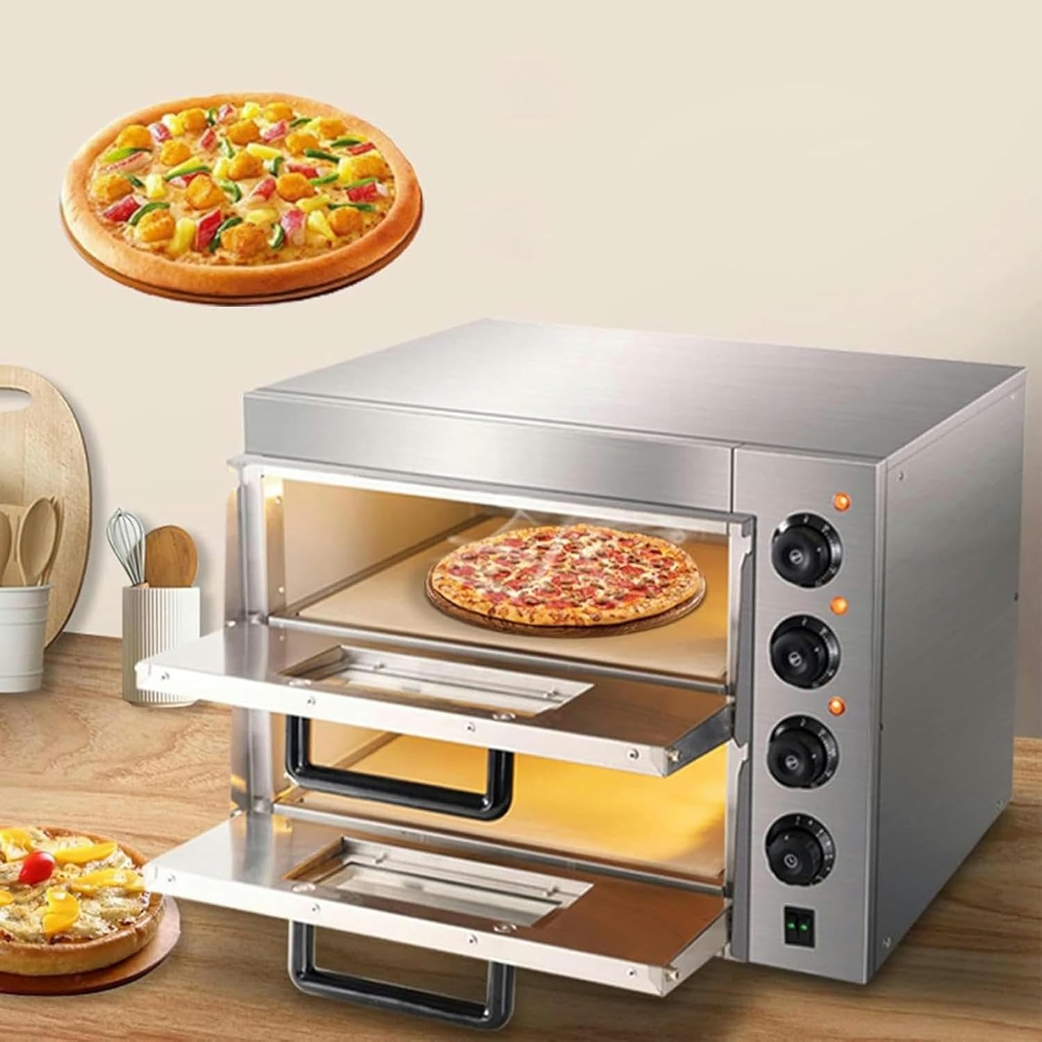 A high-quality commercial electric pizza oven cooks 12/14-inch pizzas in 15-20 minutes. Ideal for restaurants, bakeries, snack bars and parties where pizzas, cookies, sandwiches, pretzels, baked dishes and more are cooked. Premium Pizza OvenPrecise controlEven heatingHumanized detailsProduct Name: Double Layer Pizza OvenMaterial: Stainless steelVoltage: 220V 110VProduct size: 570*475*440mmRated power: 3000WLiner size: length 400mm/height 120mmProduct weight: 28kg1 x Commercial Pizza Oven1 x Pizza Stone1 shelf1 x DescriptionFeedback:If you are not satisfied with our service, or the item arrives damaged, partially missing, or the item does not match the description, please contact us as soon as possible. We will solve the problem for you and do our best to make you satisfied.