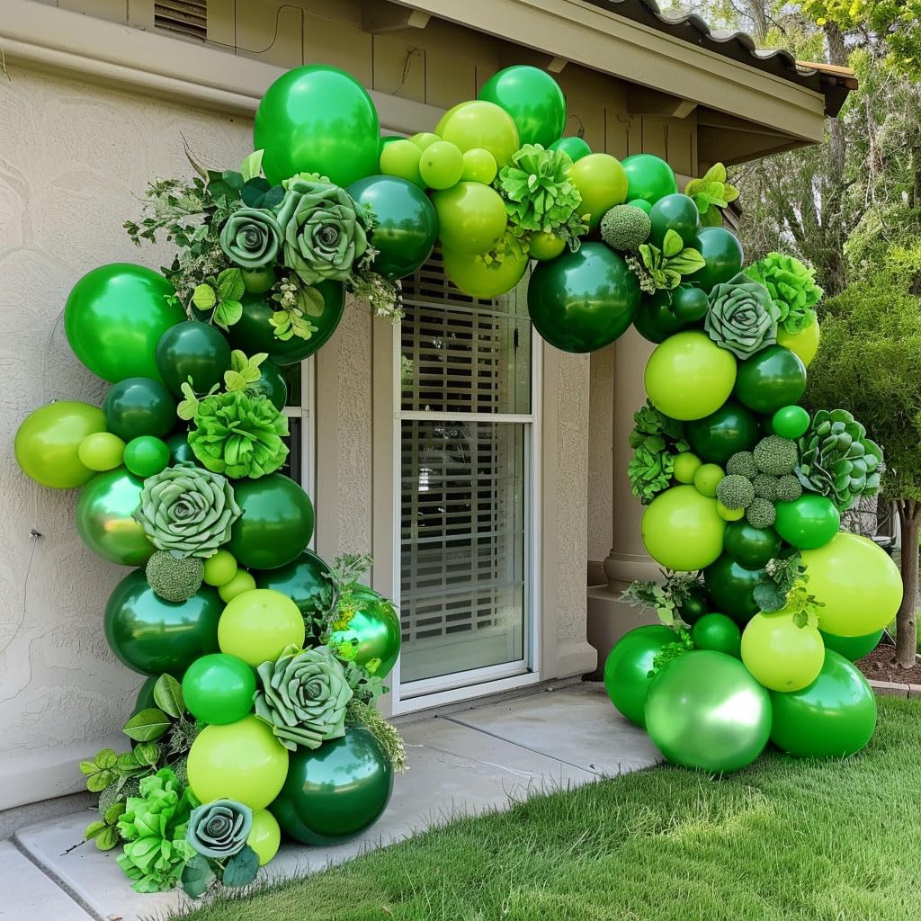 What will you receive? ◤10in x 10pcs single layer metallic green balloons ◤5inx 15pcs double stuffed dusty green balloons(black in dusty green) ◤12in x 10pcs double stuffed dusty green balloons(black in dusty green) ◤18in x 1pcs double stuffed dusty green balloons(black in dusty green) ◤5inx 15pcs single layer lime green balloons ◤12in x 15pcs double layer lime green balloons (lime green in lime green) ◤18in x 1pcs double layer lime green balloons (lime green in lime green) ◤5inx 15pcs single layer lime green balloons ◤12in x 15pcs double layer lime green balloons (lime green in lime green) ◤18in x 1pcs double layer lime green balloons (lime green in lime green) ◤5inx 15pcs single layer hunter green balloons ◤12inx 10pcs double stuffed hunter green balloons(hunter green in hunter green) ◤18in x 1pcs double stuffed hunter green balloons (hunter green in hunter green) ◤ 1 roll balloon ribbon (16ft) ◤1 roll balloon glue point (100pcs glue point) ◤1 roll white ribbon (33 ft) How to make a garland? 1. Blow up a green balloon with a balloon pump then tie knots, recommend blowing up different sizes of green latex balloons to get an amazing look to your garland. 2. Measure and cut the balloon strip to the desired length, leaving extra on each end for hanging the decoration later. 3. Pull the balloon knot through the stripped hole, skip a hole if the balloons are too tight. 4. Make it more gorgeous looking, add some eucalyptus, curling ribbon, flowers, leaves, tulle, and more. Last step: Watch YouTube "How to make green balloon garland" to learn more about green theme balloons garland style.