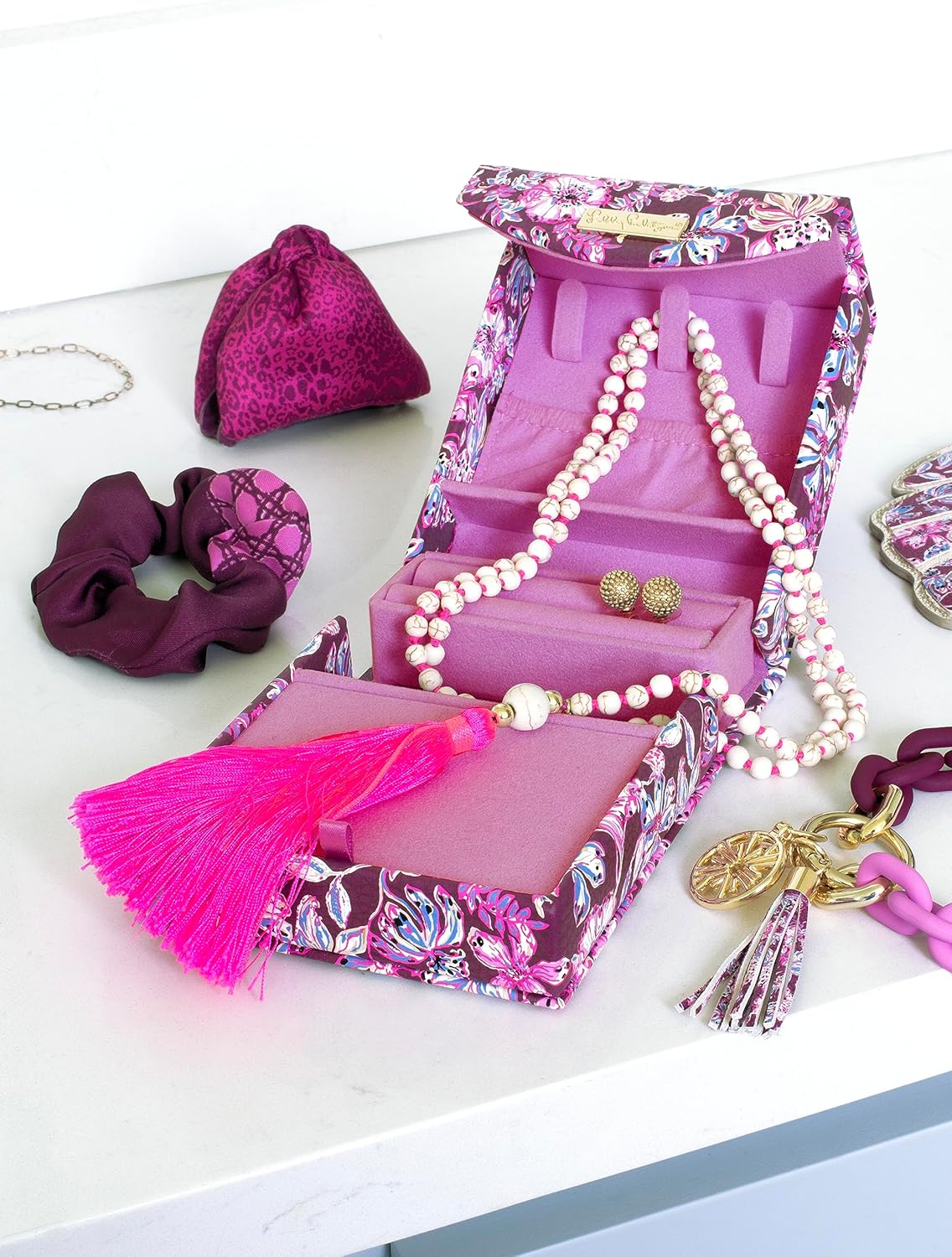 This travel jewelry organizer is essential for your next vacation. With dedicated spots for rings, necklaces, and bracelets, bringing your favorite accessories on the road is a breeze with this travel size jewelry case. Portable jewelry organizer features a firm structure that protects your pieces when on-the-go. Travel necklace organizer tangle free has 3 hooks and an elastic pouch to ensure they stay tangle-free when stored. Portable jewelry case travel also has 2 ring rolls and a compartment with 4 divided sections that you can use for small earrings or remove the divider to store bracelets and watches. Cute jewelry holder is featured in the maroon and pink pattern, Amarena Cherry Tropical with a Twist, and a gold logo plaque. Preppy jewelry holder measures 4.3 inches (W) x 4.5 inches (H) x 2 inches (L) when closed.