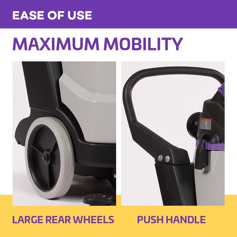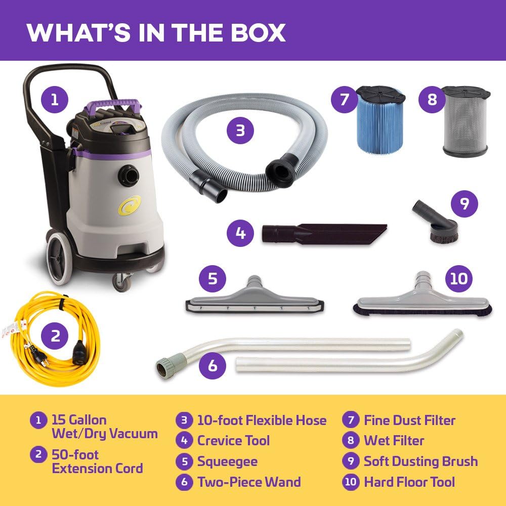 The ProTeam ProGuard 10 Wet Dry Vacuum offers durable construction and powerful performance. With rugged construction, commercial-grade tools and hose, and 10-gallon tank, this wet dry shop vacuum will keep working even in the toughest conditions. It's ideal for a variety of industries including education, healthcare, hospitality, foodservice, retail, emergency/flood cleanup, and hard floor refinishing.This wet dry vac features a powerful, 1380-watt, 9.5-amp motor that produces an airflow of 105 CFM and 95-inch static lift. At only 28 pounds, this wet and dry vacuum cleaner is easy to transport. An ergonomic handle and smooth caster wheels provide even more mobility. This wet dry vacuum cleaner features an extra-long, 50-foot 14-gauge power cord to provide plenty of reach. The patented Quick Lock Fine Dust Filter and Wet Filter allow for easy filter removal and replacement.The ProGuard 10 wet and dry vacuum cleaner includes a 10-foot x 1-1/2-inch dry wet vacuum hose, 2-piece wand, bristle floor tool, squeegee tool, crevice tool and dust brush.For more than 25 years, ProTeam has designed vacuums with durability and quality in mind. ProTeam wet dry vacuums are low maintenance, long lasting, and feature meticulous workmanship and the finest materials available. Because of its uncompromising quality, ProTeam covers this wet and dry vacuum cleaner with a 3-year warranty on parts, labor, and motor and a lifetime warranty on molded body parts.
