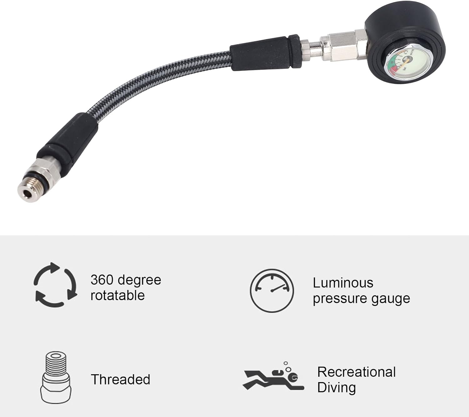 Spec:Item Type: Diving Pressure GaugeMaterial: Carbon Fiber Weave, Aluminum AlloyPipe Diameter: Approx. 8mm/0.31inpacking list:1 x Diving Pressure Gauge
