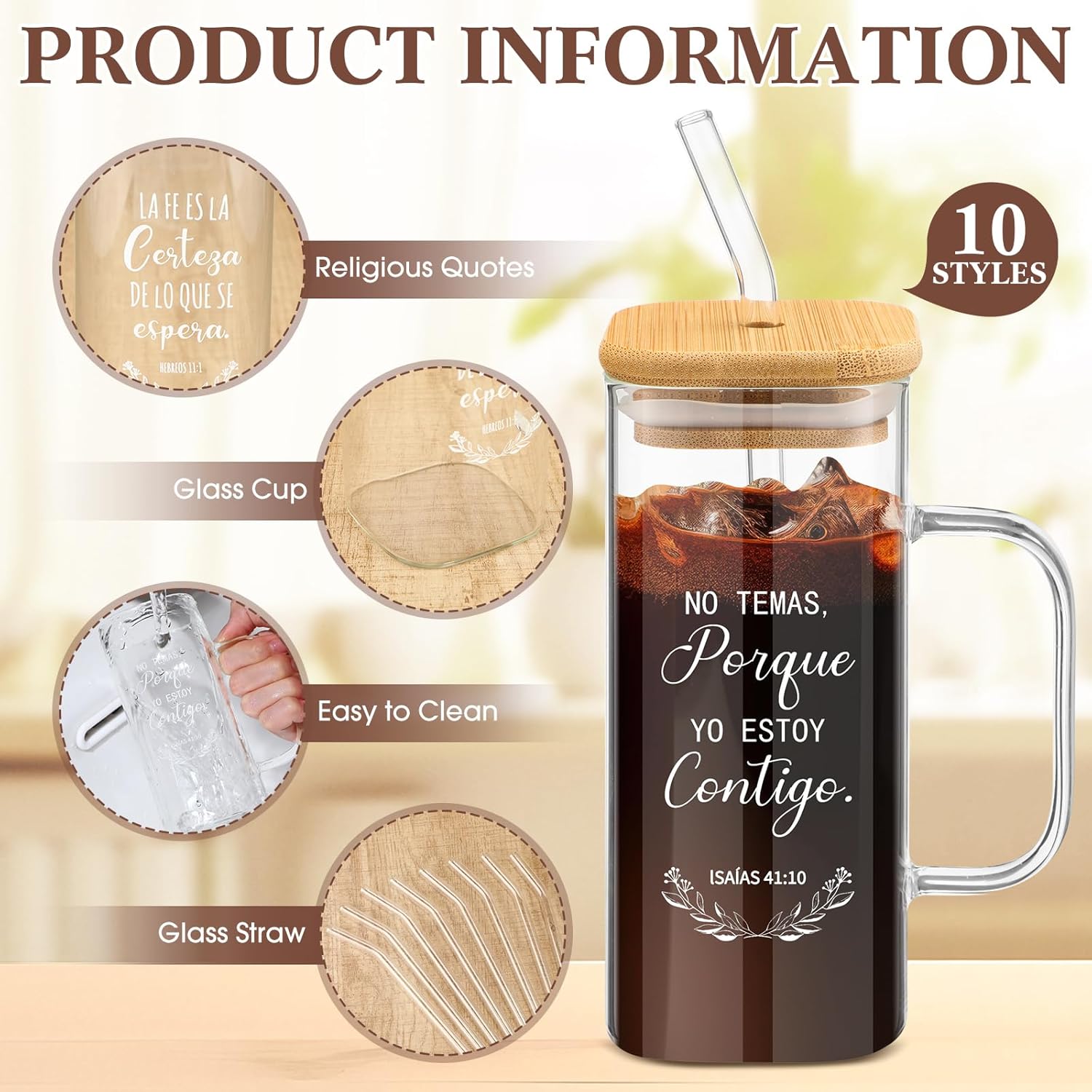 Features: These Spanish Christian glasses with lids make for a wonderful gift. Whether it's on Christmas, Mother's Day, a birthday, or just a random act of love, these glasses are a unique way for you to express your affection and share words of encouragement to the important women in your life Enrich the lives of your loved ones with our inspirational and religious tumblers. Printed with relevant Christian scriptures, these sets make ideal gifts for friends, coworkers, and any woman who needs motivation and strength Specifications: Material: mainly glass Color: as shown in the picture Size: The Christian glass: 13.5 oz/ 400 ml Package includes: 10 x Christian glass with lid 10 x Glass straws 10 x Cup sleeves 10 x Cleaning brushes Notes: Manual measurement, please allow slight errors on size. The color may exist a slight difference due to different screen displays.