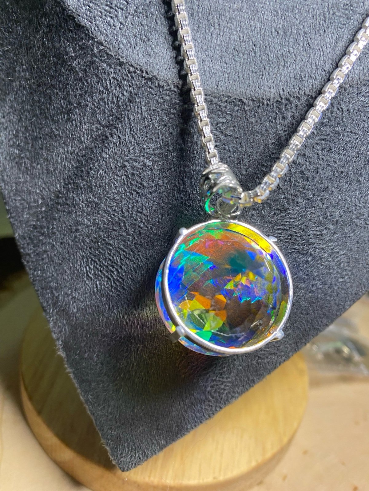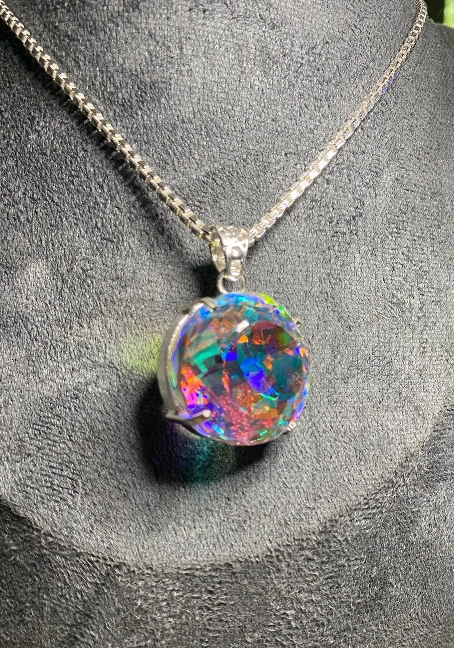 This stunning Quartz pendant is loaded with color. It features a dazzling array of colors, set in a sleek Sterling Silver setting. Please note, no special effects were done and there is no enhancement to this pendant. Pictures were taken in natural lighting. It’s just simply stunning.