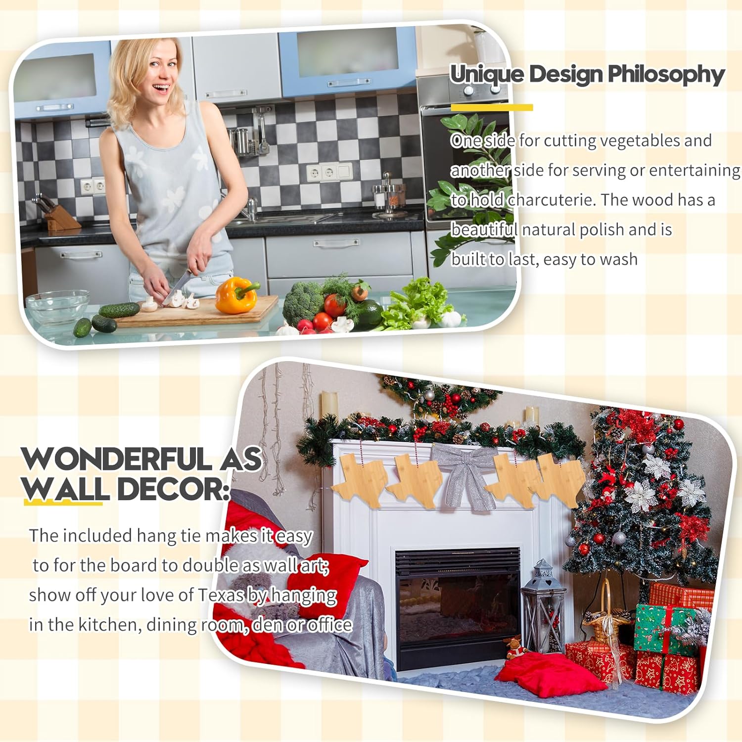 Features: Multi functional use: Spanning approximately 14.17 x 13.39 x 0.31 inches/ 36 x 34 x 0.8 cm in size, this wood serving and cutting board is a versatile solution for various cutting and serving needs. When you're finely chopping vegetables or serving appetizing entrees, this board will enhance your culinary experience. Artful display: The laser engraving feature spotlights the wooden Texas souvenirs gifts' inherent characteristic of enabling an artful display. Owners will easily elevate their entertaining game with the creative features of these boards. Specifications: Material: mainly wood and bambooColor: wood colorSize: about 14.17 x 13.39 x 0.31 inches/ 36 x 34 x 0.8 cmPackage includes: 4 x Wood chopping boardNotes: Manual measurement, please allow slight errors on size. The color may exist a slight difference due to different screen displays.