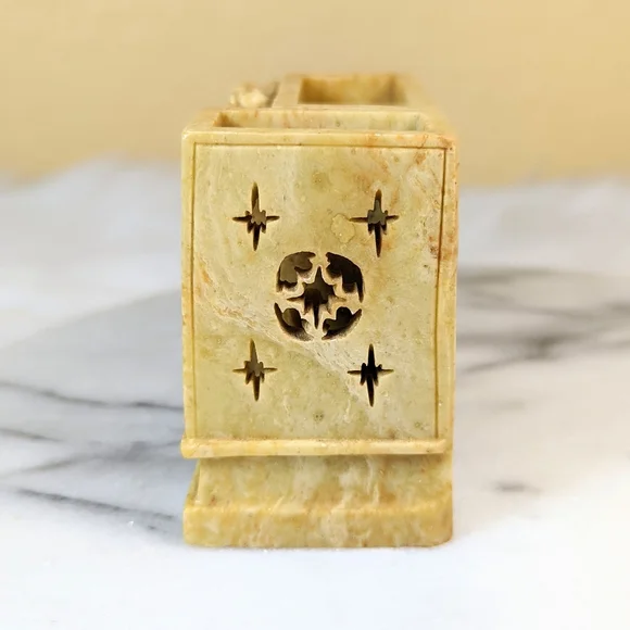 Welcome to my closet 😊 Thank you for visiting!In excellent condition with no chips or cracks. There's a line on the back that shows the end of the vase was possibly added. Please examine photos closely.Beautiful hand carved floral on the front.Two compartments. It would look gorgeous with an air plant in it or to hold odds and ends on a desk.
