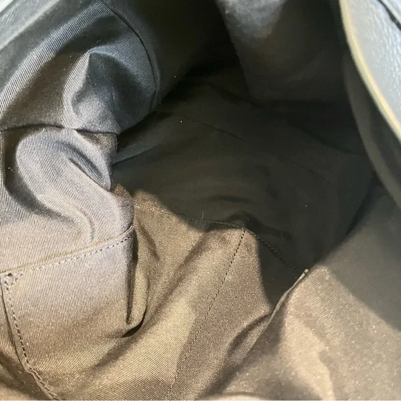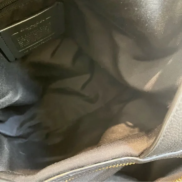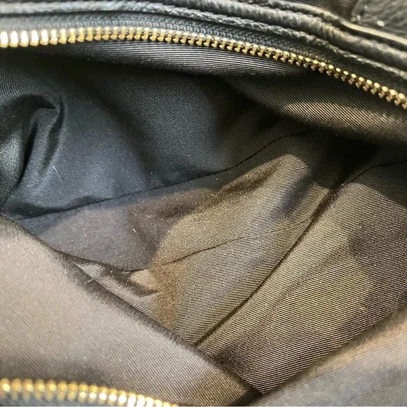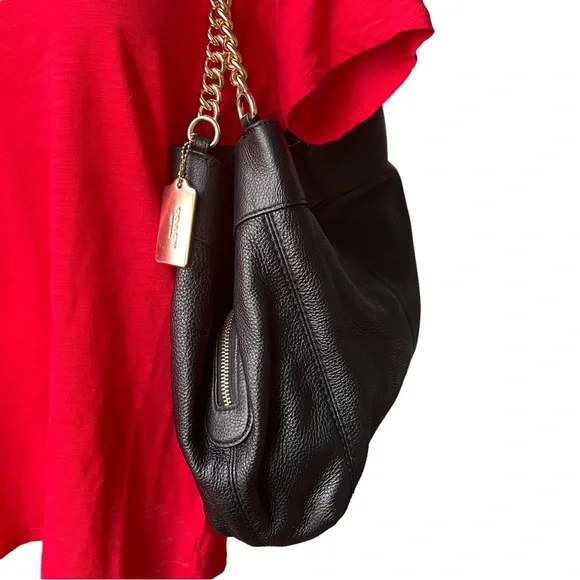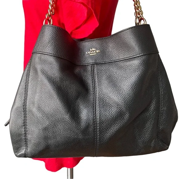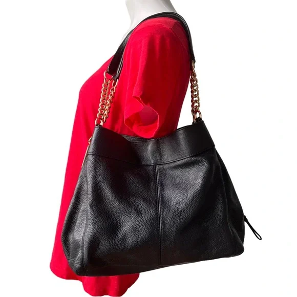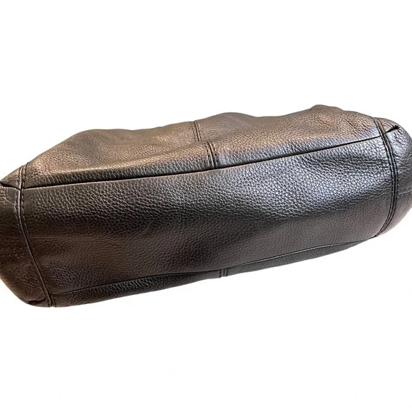 Beautiful pebbled leather shoulder bag in light pinkDual flat leather handles with 8" drop and gold tone chain link detailGold tone logo plate on frontInterior lined in black fabricMagnetic snap closure with center zip enclosure 3 separate interior compartments with center pocket zipper closure1 zipper pocket along interior rear wall2 slip pockets along interior front wallMagnetic snap main closure Hardware is polished gold toneApprox Measurements: 16" w x 11" h x 4" dPre-owned, very good condition.Interior has very minor light marks.