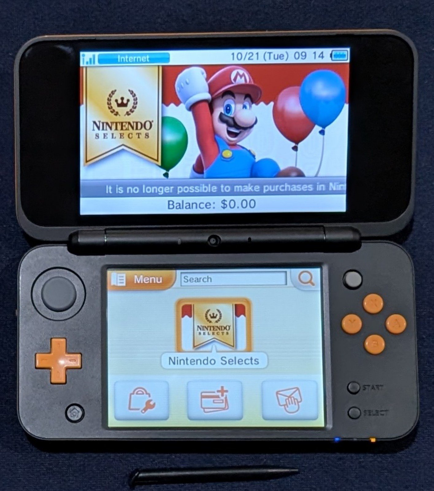 Up for sale is a used Nintendo "New" 2DS XL Console in orange and black. This was created by merging a blue and black system with an orange and white system. Includes the 2DS XL, stylus, USB charging cable, and 64 GB microSD card. No original packaging included.