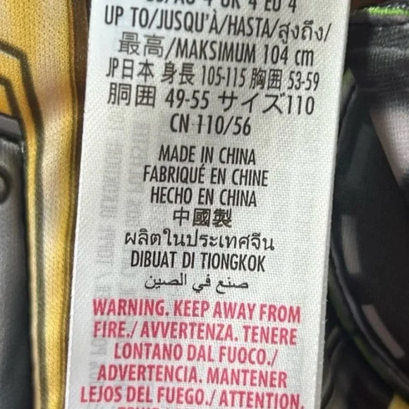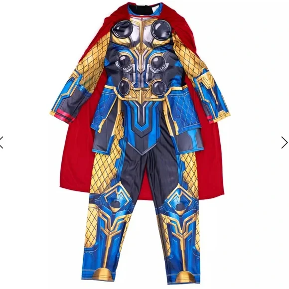 Let your little ones become heroes of the galaxy in this Thor costume! Featuring all-over screen art, a bold cape, and a plastic mask with moulded details, your little ones will be ready for a day full of cosmic adventures!Magic in the detailsInspired by Thor: Love and Thunder4 piece setIncludes: top, bottoms, mask, and removable capePlastic mask with moulded details, cut-out eye holes and elastic strapStretchy material with all-over screen art on top and bottomsSelf-adhesive tab fastenings down back of topSelf-adhesive tab fastenings on shoulders to attach capeCape features soft-feel finishBottoms feature elasticated waistbandCreated for for Disney StoreThe bare necessitiesMask is made from plastic, excluding trimsTop and bottoms: 100% polyester, excluding trimsTop and bottoms - coating: 100% polyurethaneFoam: 100% polyurethaneHand wash only