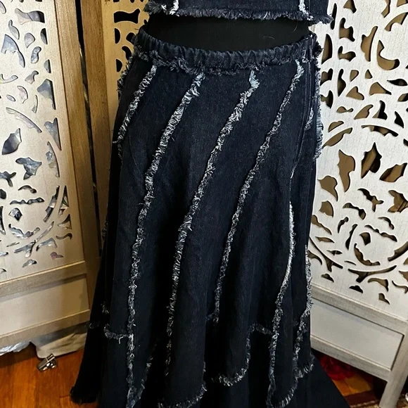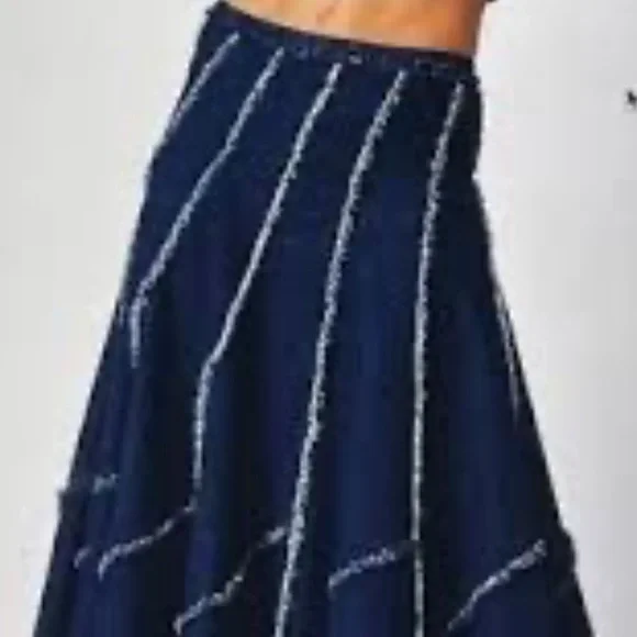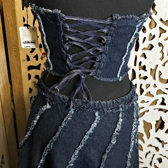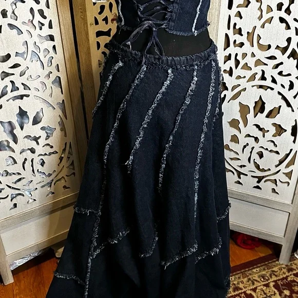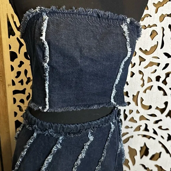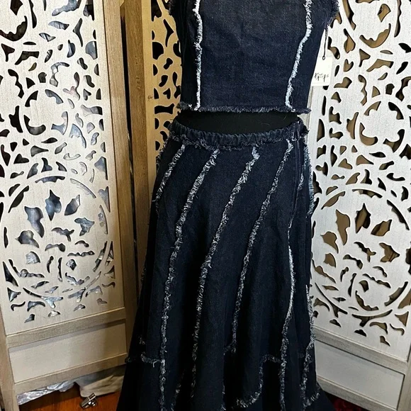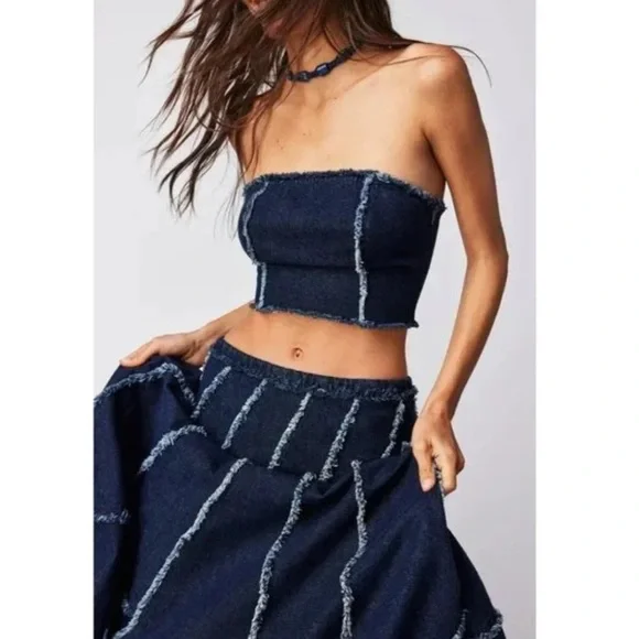 Stun in this so special set featuring a super cropped, strapless top and coordinating high -rise maxi skirt both featured in a staple dream fabrication with exaggerated seaming for added dimension.Size 2NWOT Top: Length 9.5”Elastic topStrapless styleSuper cropped fitLace-up back for adjustmentSide zipperDistressing at seamsSkirt:Length 34”, back 43”High-rise styleDistressing throughoutSide-zip closure100% Cotton