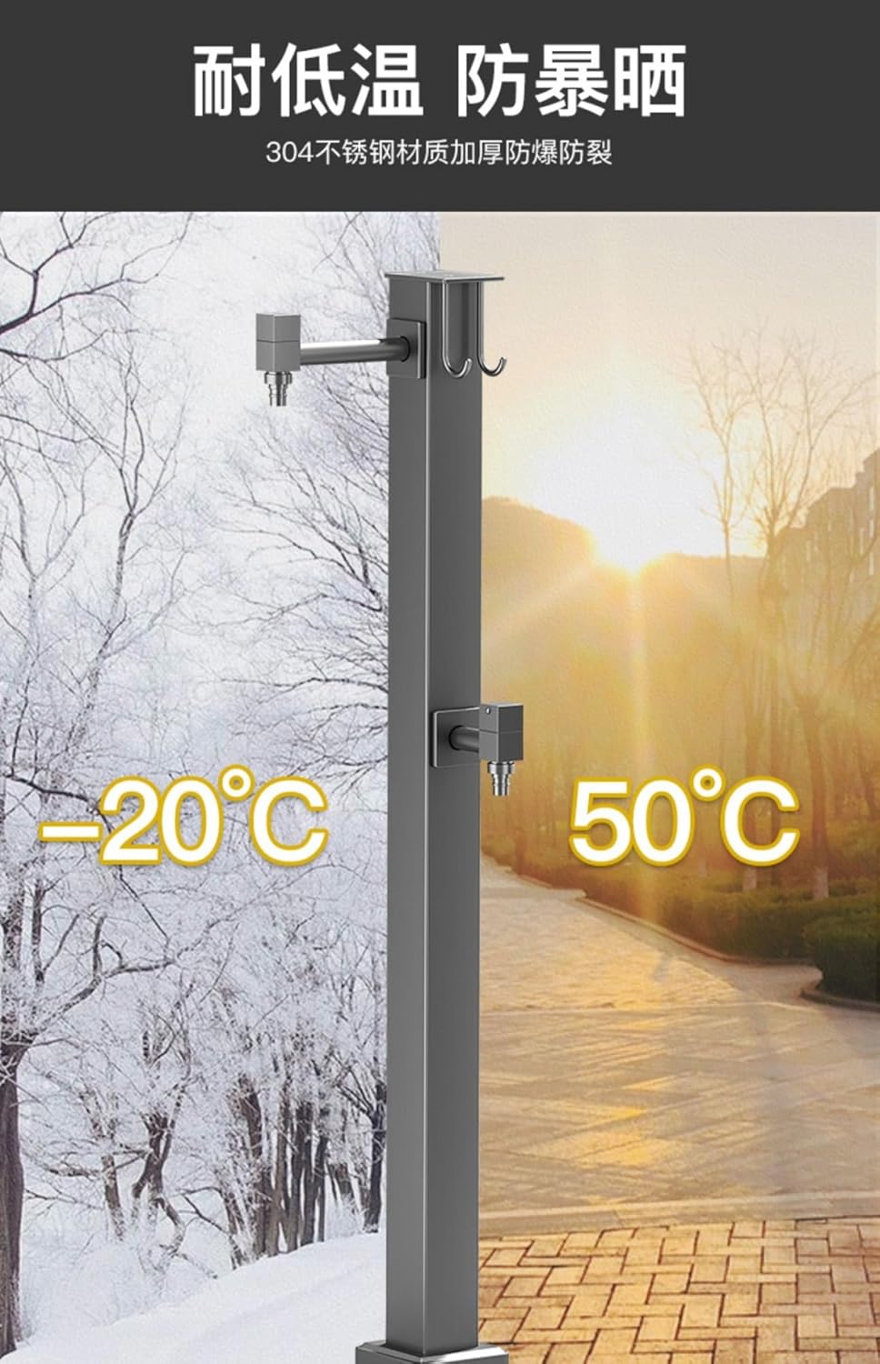 The vertical water column is crafted from robust 304 stainless steel with integrated freeze proof insulation cotton, it offers year-round durability and functionality. Features: The water