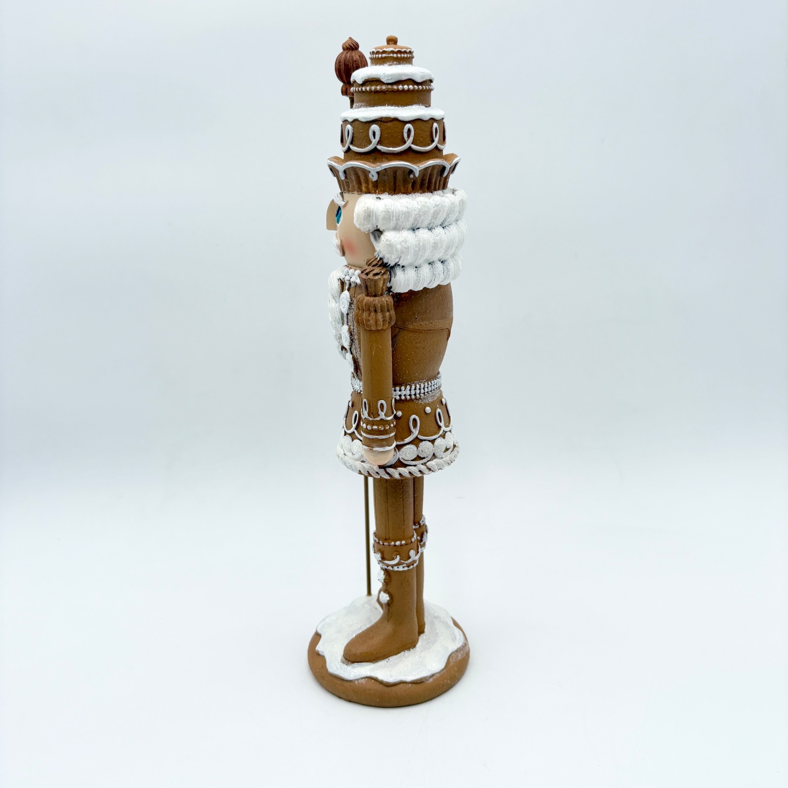 Charming gingerbread nutcracker figurine, adding a touch of festive cheer to your holiday decor. This delightful statue showcases a classic nutcracker design with a gingerbread twist, featuring a warm brown color palette accented by intricate white icing-like details. From the ornate crown atop its head to the snowy base, every detail is meticulously crafted to evoke the cozy feeling of a gingerbread house. With its cheerful expression and traditional stance, this nutcracker is the perfect addition to your mantelpiece, tabletop display, or holiday village. Ideal for adding a whimsical touch to your Christmas celebrations or creating a festive ambiance in your living room during the winter season.