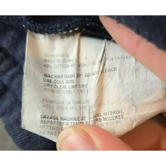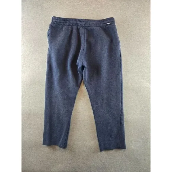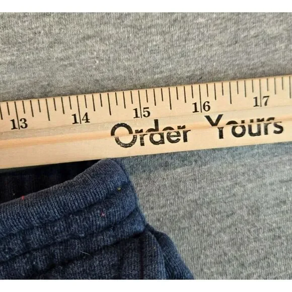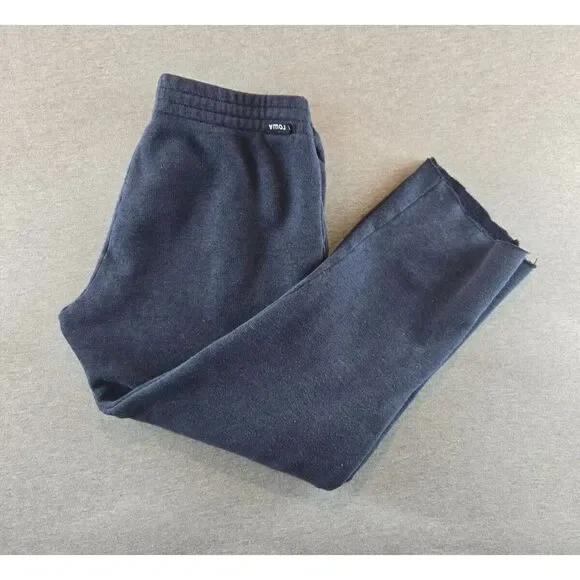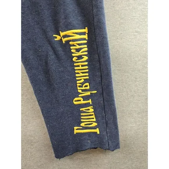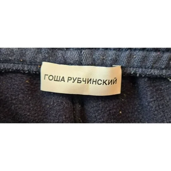 This is a pair of Gosha Rubchinskiy men's sweatpants in size M, featuring a speckled navy color with embroidered logo detailing. Made from a blend of viscose and cotton in French Terry fabric, these pants have a straight leg style with a 24-inch inseam. The pants have a solid pattern and a flat front design, with an elastic waist and adjustable waistband for comfort. Ideal for travel or casual wear, these sweatpants are machine washable and have pockets for added convenience.Good condition. Raw hem 3/4 length. Perfect for Gym or runningNon smoker. See pics for measurements. No holes or stains