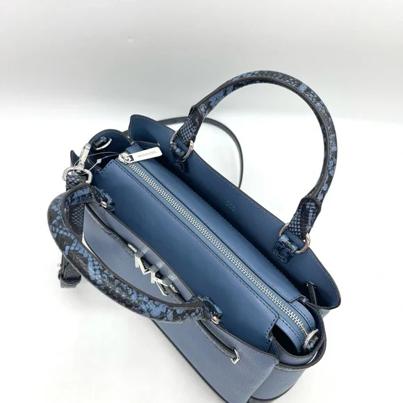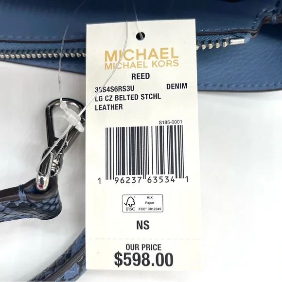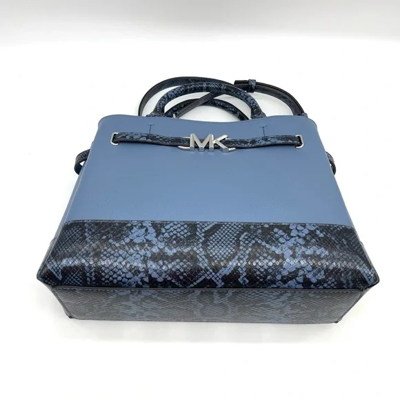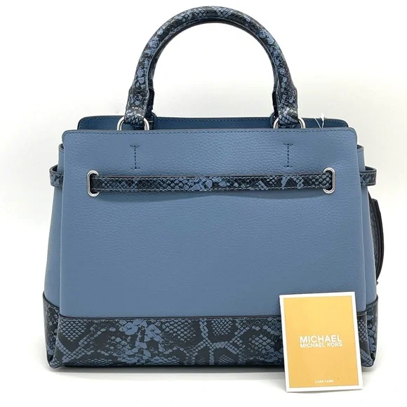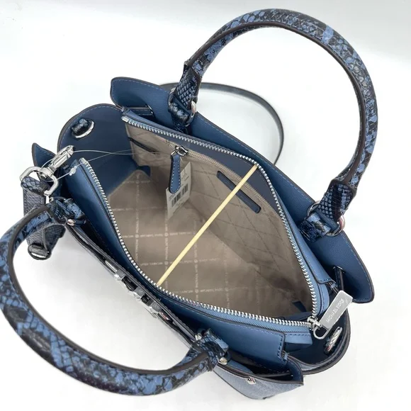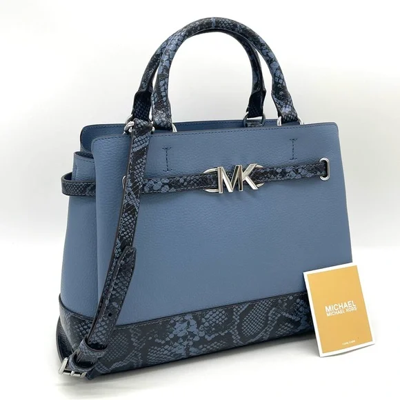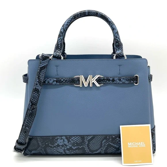 Brand New with TagMichael Kors Reed Large Center Zip Satchel Crossbody BagDETAILSColor: DenimSnakeskin Leather• Satchel• Logo-print canvas• 89.4% coated canvas/9.6% polyester /1% polyurethane• Trim: 60% polyurethane/20% cotton/20% polyester• Silver-tone hardware• 13.25 W X 9.25"H X 5.25 D• Handle drop: 4"• Adjustable strap: 18.5"-22.25"• Interior details: back zip pocket, front slip pocket• Lining: 100% polyester• Zip fastening• Dust bag not included• Imported