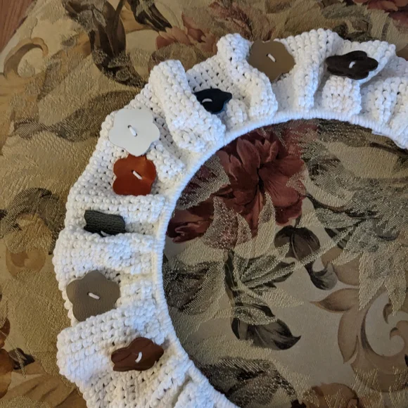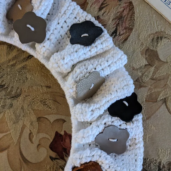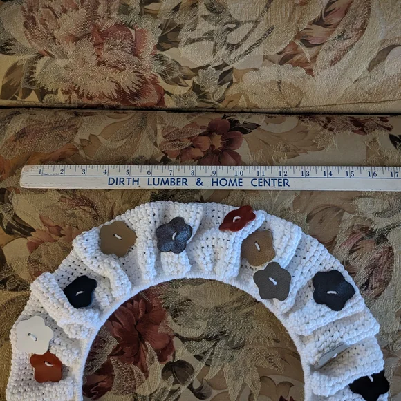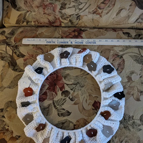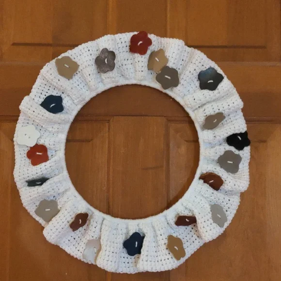 Beautiful handmade crochet wreath made with 100% cotton yarn. Features multicolor genuine leather flower accents in muted colors. Perfect for home decor. Unique decor piece adds a springtime vibe.Sustainably made using the magic yarn ball method. Scrap yarn from other projects are joined together with knots. One of a kind. Made in the USA. Genuine Leather. Handmade using sustainable genuine leather castoffs from the fashion and upholstery industries. Some imperfections in the leather due to variabilities with animal hides. Leather flowers are cut and affixed by hand to a metal wreath ring. I first crocheted around the ring using scrap yarn leftover from other projects.Unique home decor piece! Works for the holidays or as contemporary, minimalist, rustic decor all year long!