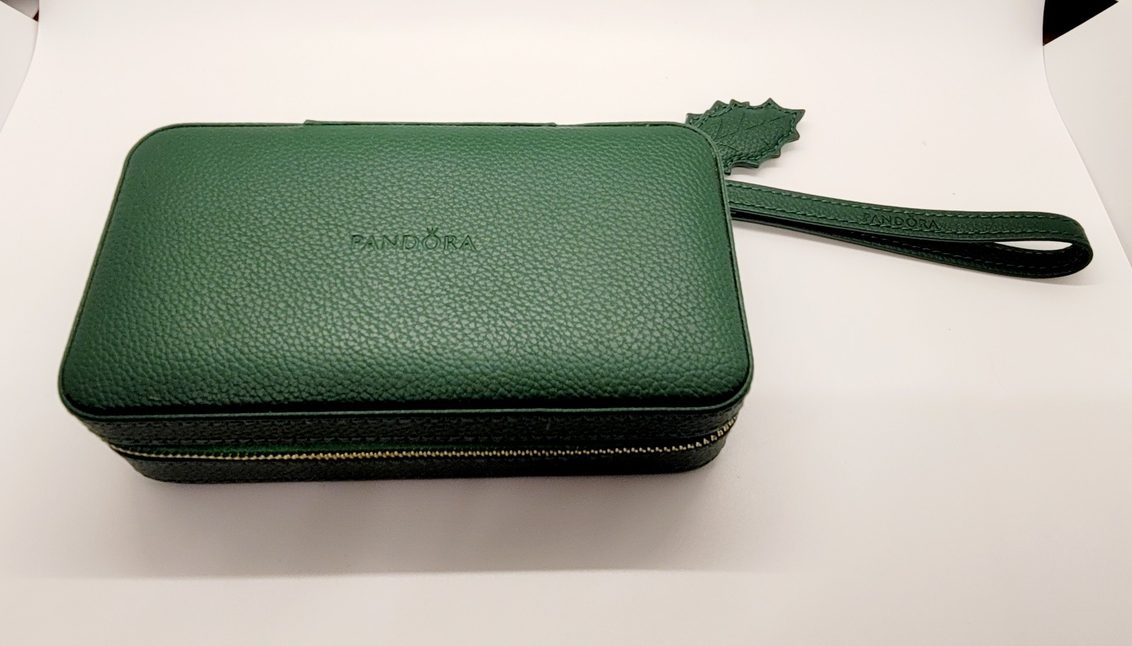 Pandora Limited Edition Green Jewelry Box Travel Organizer. Features multiple compartments, full zip, with a small jewelry pouch. Perfect for travel. Includes wristlet/charm. Inside is in great condition.