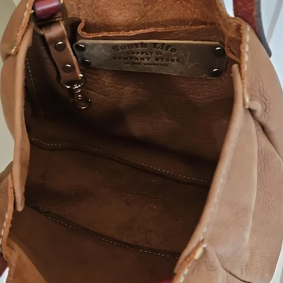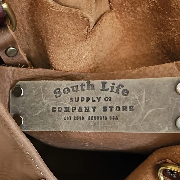 Southlife Supply Co Small Bucket Bag:Handmade in Thomasville,GAColor- Buffalo LeatherInterior pocket, built in key clip, snap closure, unlined, full grain cowhide,bridle leather straps, brass hardware9"h x 10"l x 4" w6" strap drop lengthI own quite a few of their bags and this one doesn't get used like the others. Very well made!