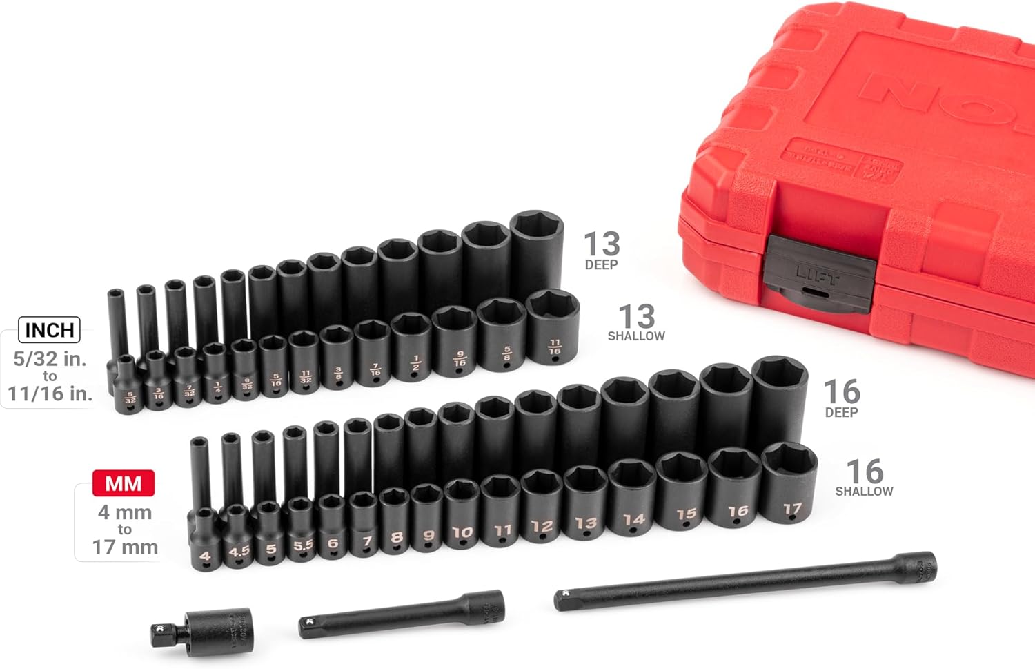 | Included Components | 1/4 in. drive universal joint, 13-pc. 1/4 in. drive 6-point impact sockets: 5/32, 3/16, 7/32, 1/4, 9/32, 5/16, 11/32, 3/8, 7/16, 1/2, 9/16, 5/8, 11/16 in., 13-pc. 1/4 in. drive deep 6-point impact sockets: 5/32, 3/16, 7/32, 1/4, 9/32, 5/16, 11/32, 3/8, 7/16, 1/2, 9/16, 5/8, 11/16 in., 16-pc. 1/4 in. drive 6-point impact sockets: 4, 4.5, 5, 5.5, 6, 7, 8, 9, 10, 11, 12, 13, 14, 15, 16, 17 mm, 16-pc. 1/4 in. drive deep 6-point impact sockets: 4, 4.5, 5, 5.5, 6, 7, 8, 9, 10, 11, 12, 13, 14, 15, 16, 17 mm, 2-pc. 1/4 in. drive impact extensions: 3, 6 in., carrying case |