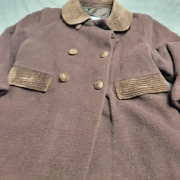This coat screams timeless sophistication yet says, “I know how to stay warm.” The corduroy accents add a touch of grandpa chic, and the wool blend ensures you’ll survive winter, or at least look stylish trying.• Double-breasted button closure• Corduroy collar and pocket accents• Back button tab for added style• Two functional front pockets• Made in SpainNo significant flaws detected, minimal wear on fabric consistent with age. Top to bottom = 28 inches, shoulder to shoulder = 15 inches.