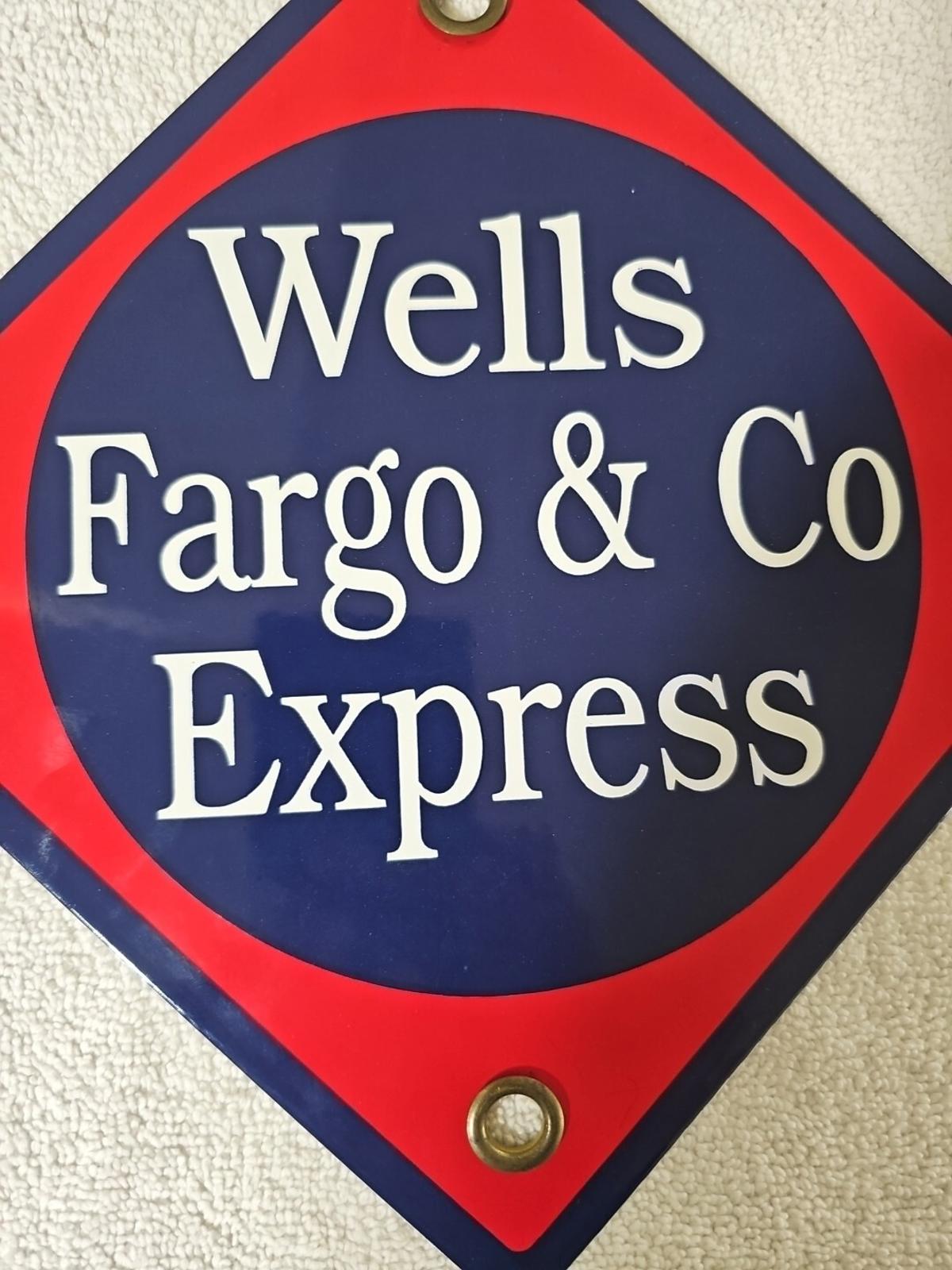 This vintage porcelain advertising sign features the iconic Wells Fargo & Co Express logo. Measuring at 8 inches, it would make a great addition to any collection or decor. The sign was manufactured in the United States and is perfect for enthusiasts of advertising and concession themes. It would also make a great addition to restaurants and food service businesses looking for unique decor. Don't miss out on this piece of history!