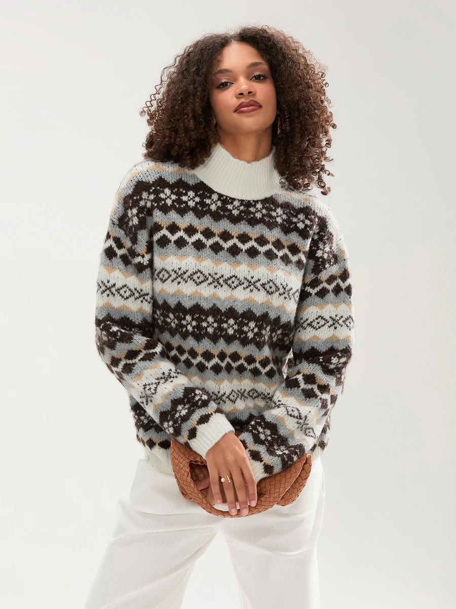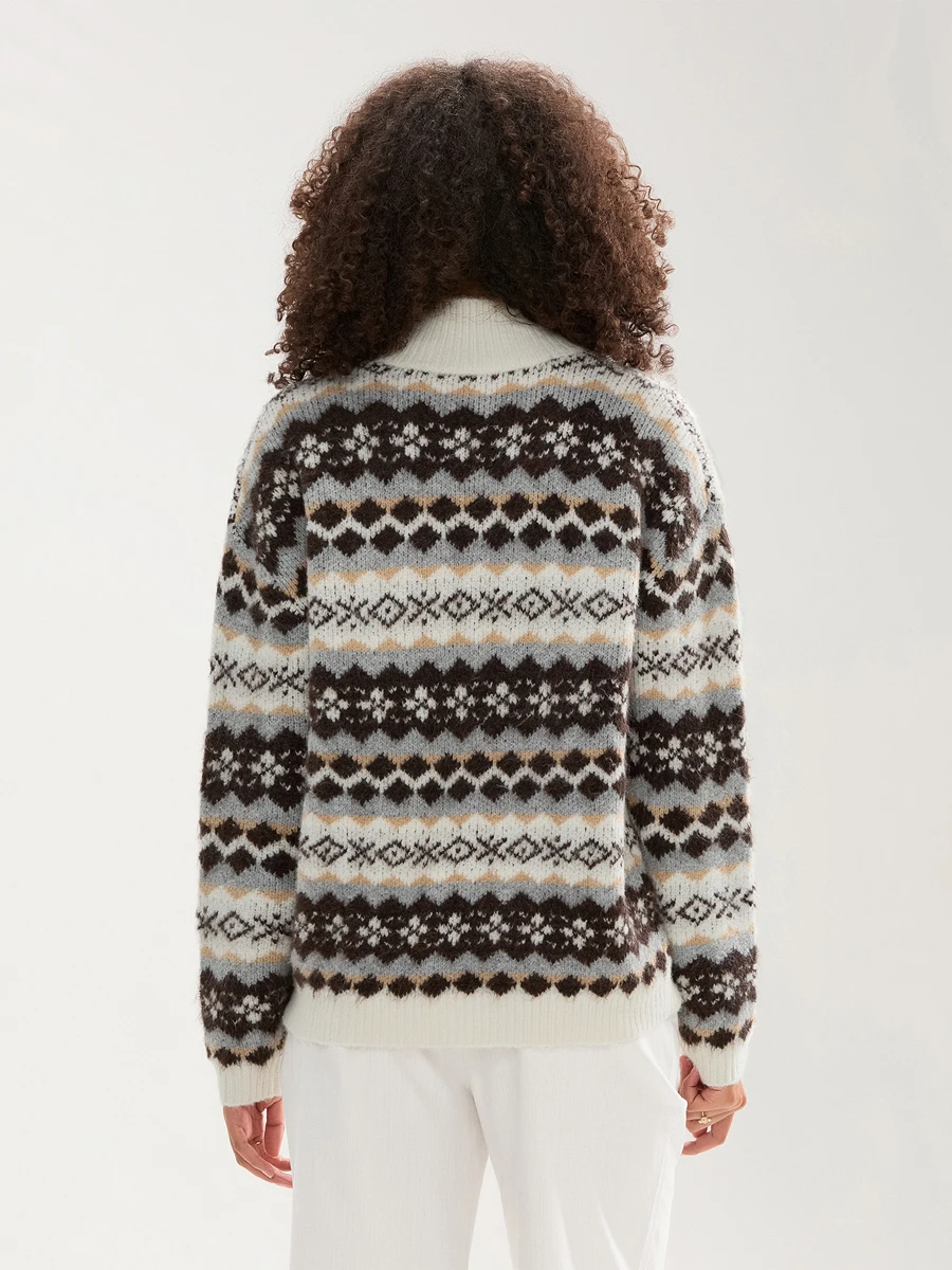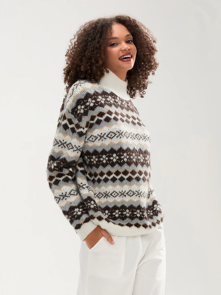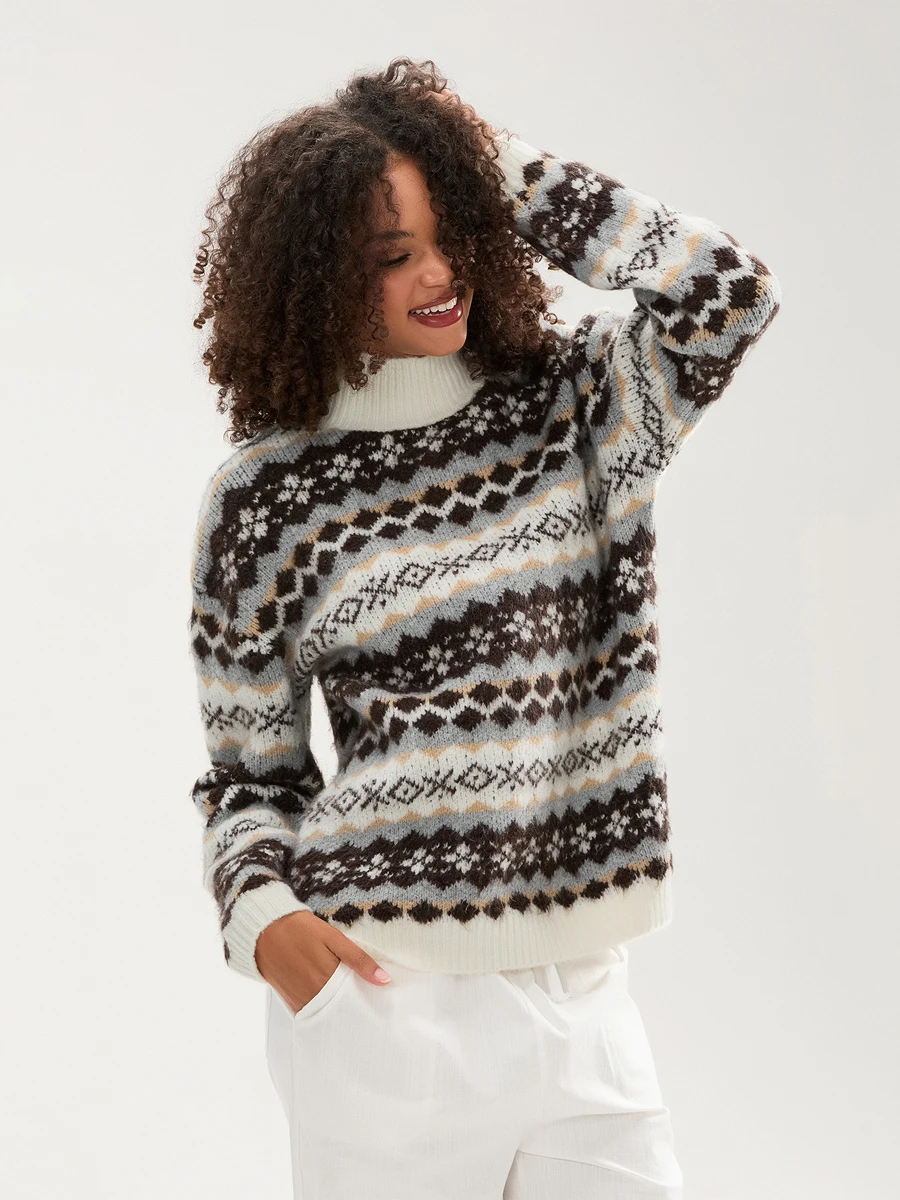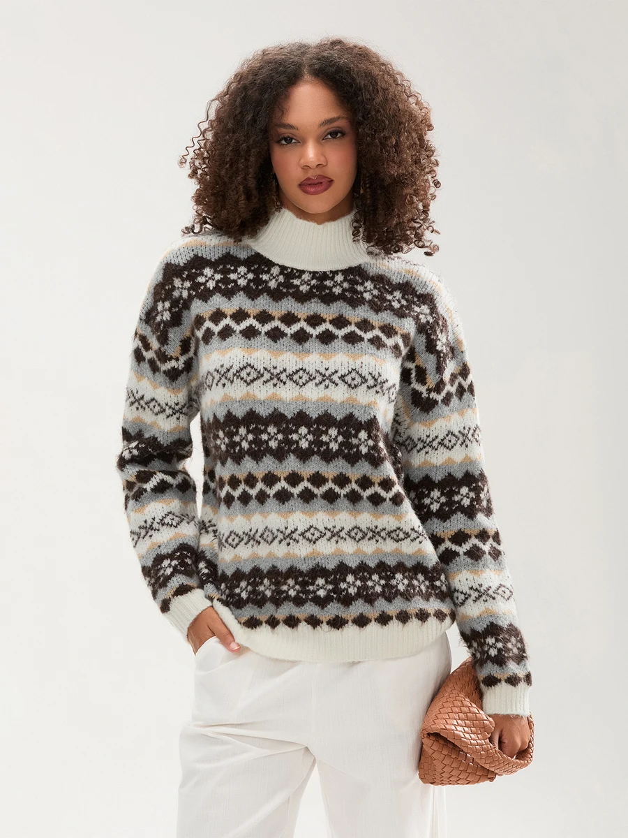 Women's Retro Print Fall Sweater Long Sleeve High Neck Loose Knitwear Winter Pullover