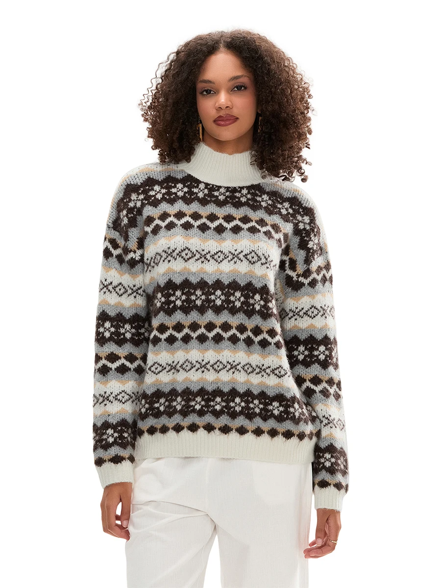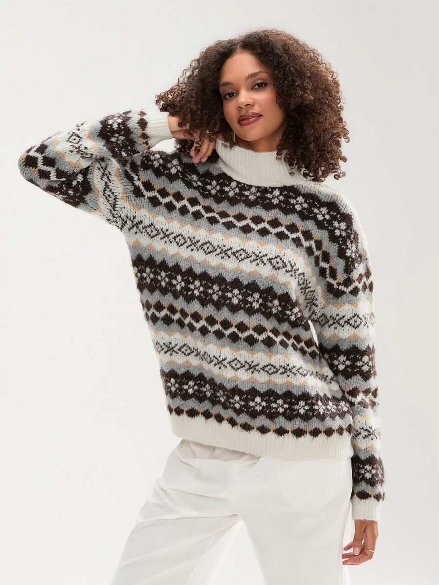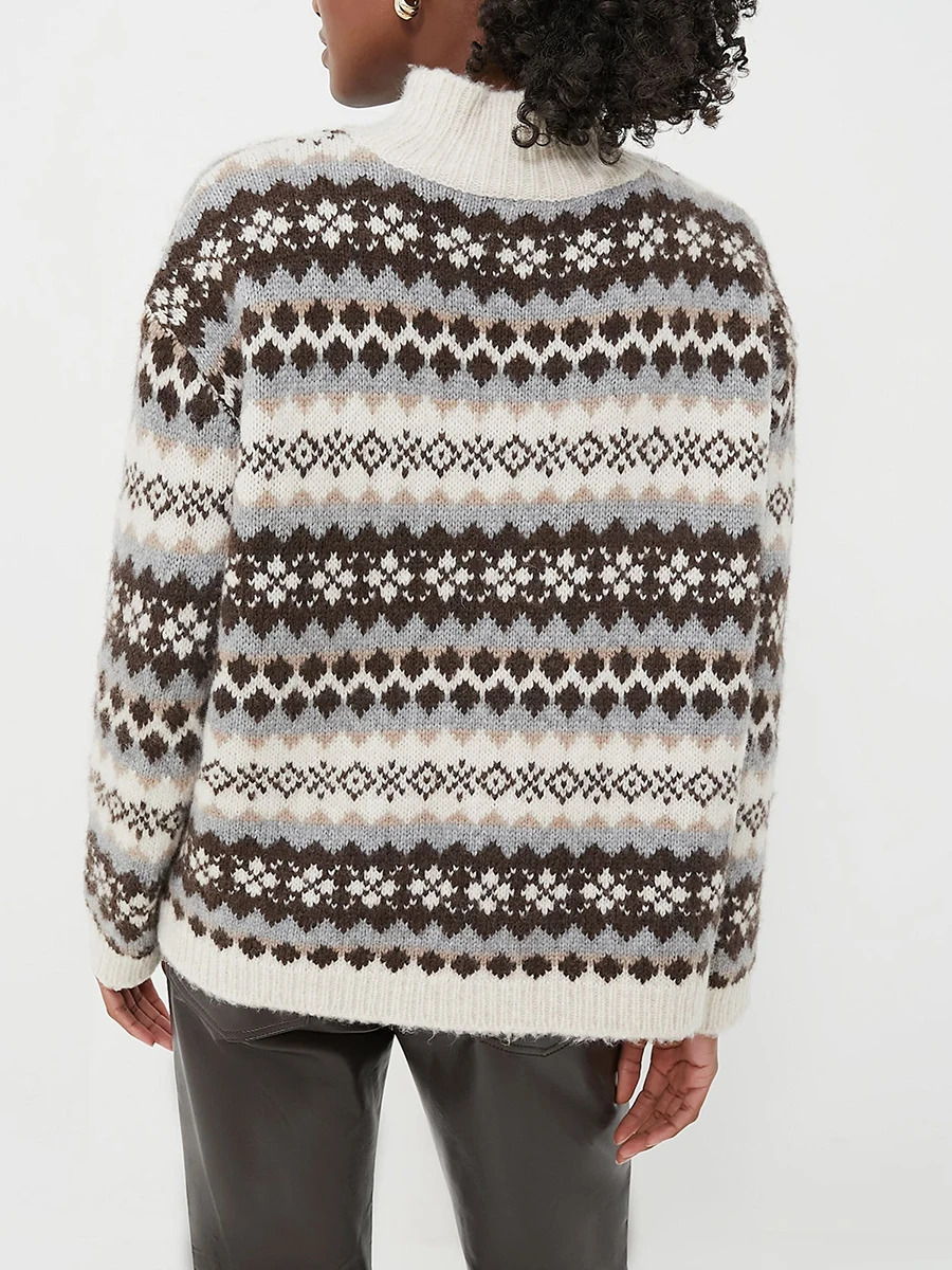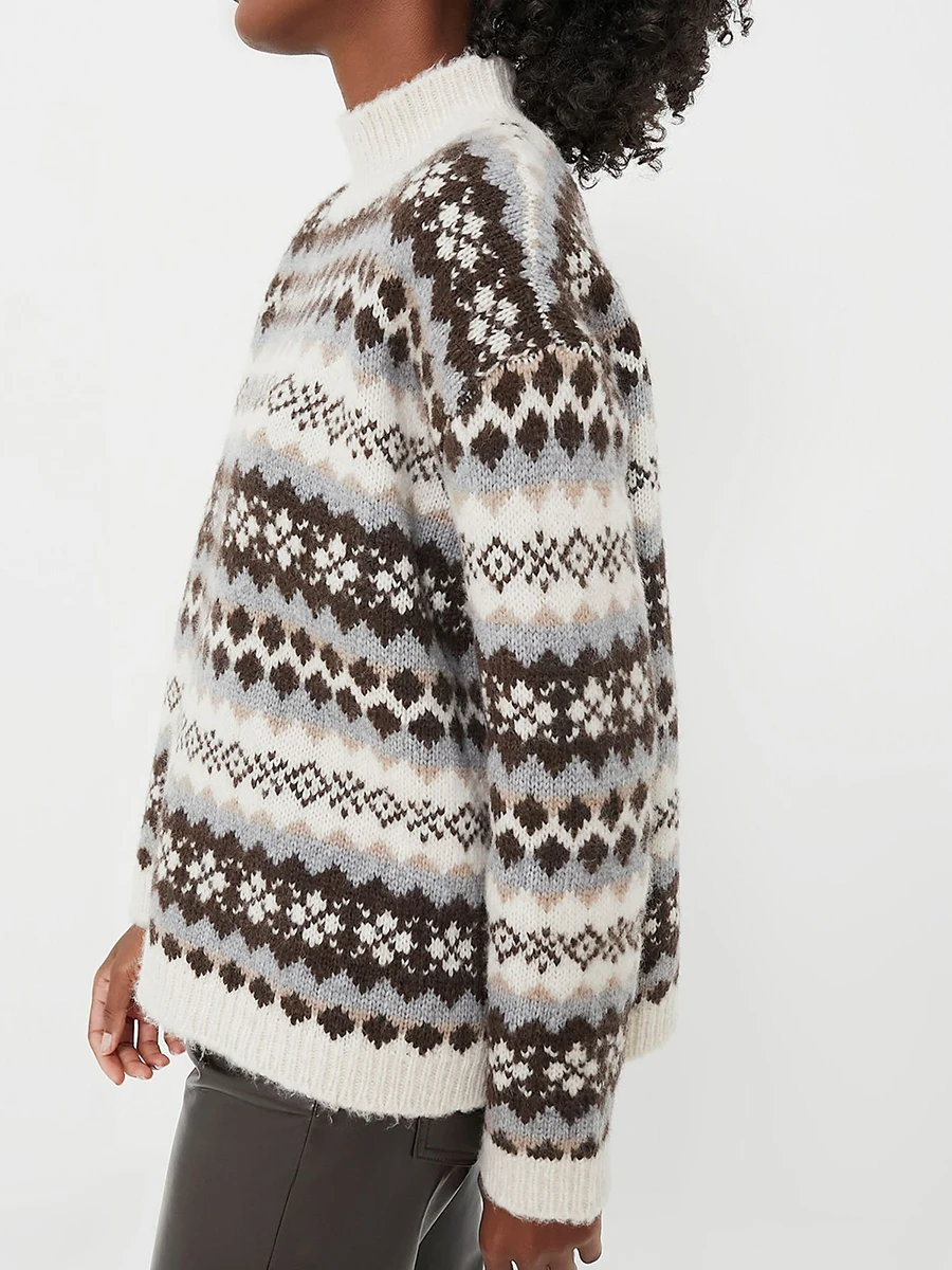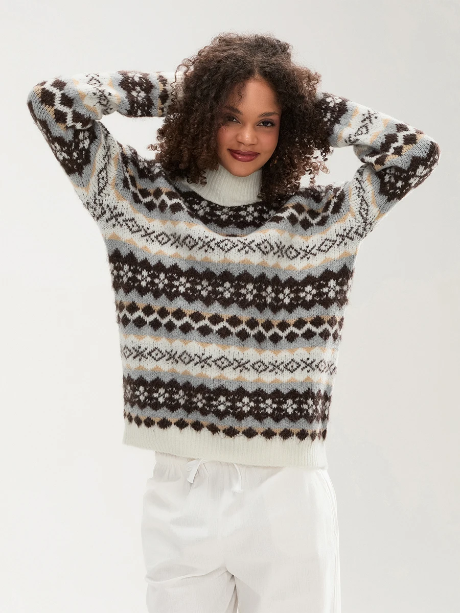 Women's Retro Print Fall Sweater Long Sleeve High Neck Loose Knitwear Winter Pullover