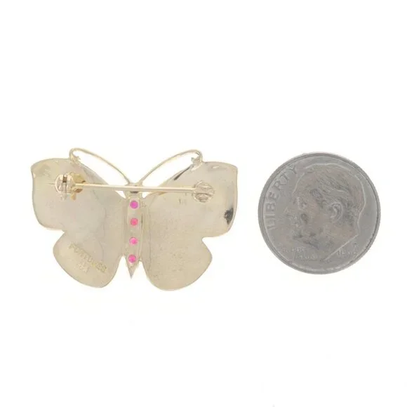 Metal Content: 14k Yellow GoldStone InformationNatural RubiesTreatment: HeatingCarat(s): .20ctwCut: Round BrilliantTotal Carats: .20ctwStyle: BroochFastening Type: Hinged Pin and Whale Tail ClaspTheme: Butterfly, NatureFeatures: Etched DetailingMeasurementsTall: 13/16" (20.6mm)Wide: 1 3/16" (30.1mm)Weight: 5.8 GramsStamps: 14k, FortunesCondition: Pre-OwnedProfessionally cleaned, polished, and tested to guarantee metal content.