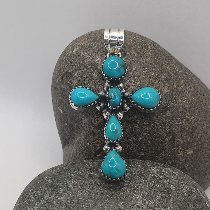 This exquisite pendant features a cross design, meticulously crafted in sterling silver and adorned with a striking Kingman Mine turquoise stone. Perfect for any occasion, it makes a bold statement of faith and style.